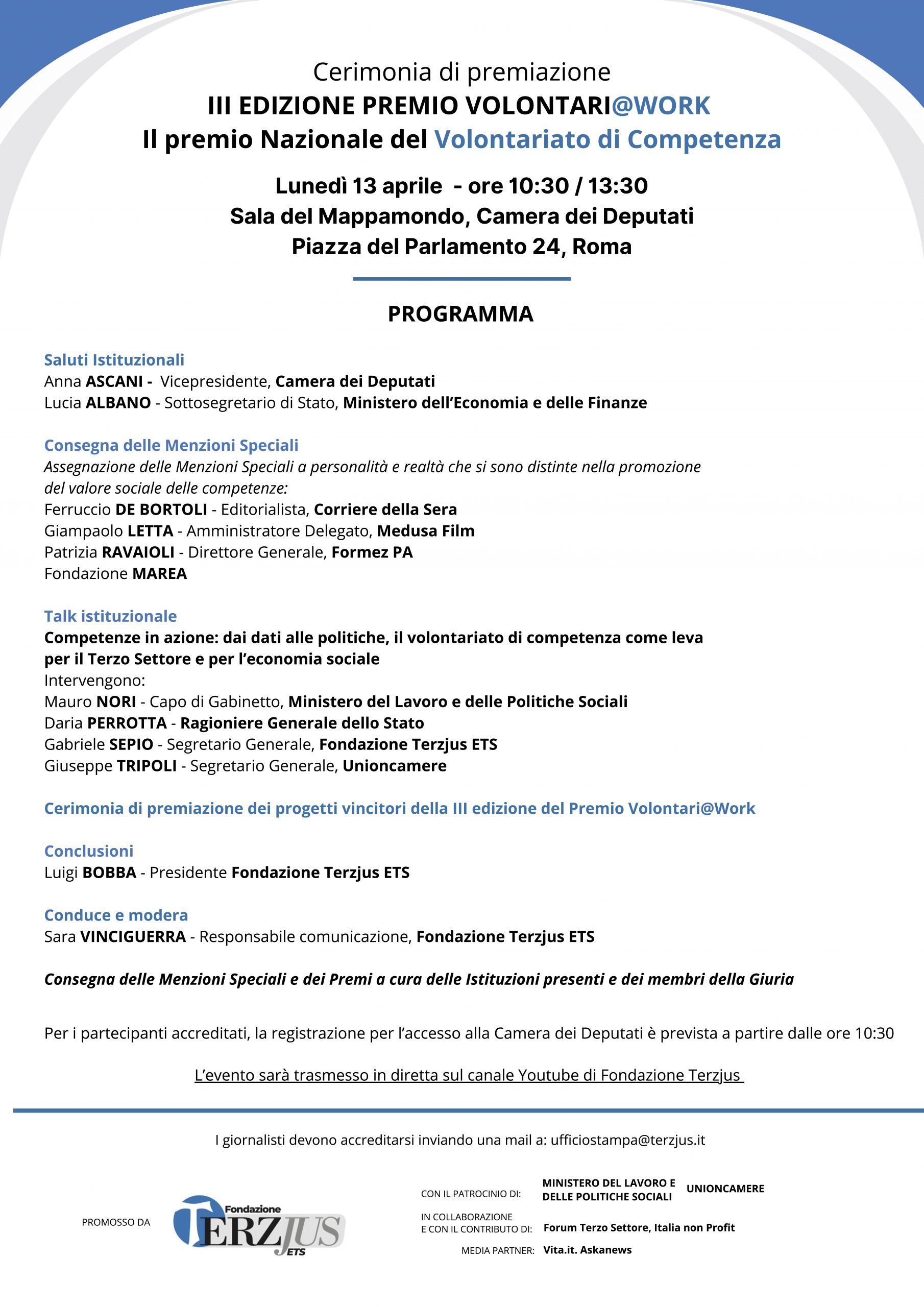 Sono 52 la candidature al premio Volontari@Work per il 2026. Cerimonia di Premiazione il 13 aprile, ore 10:30, Sala del Mappamondo, Camera dei Deputati, Roma