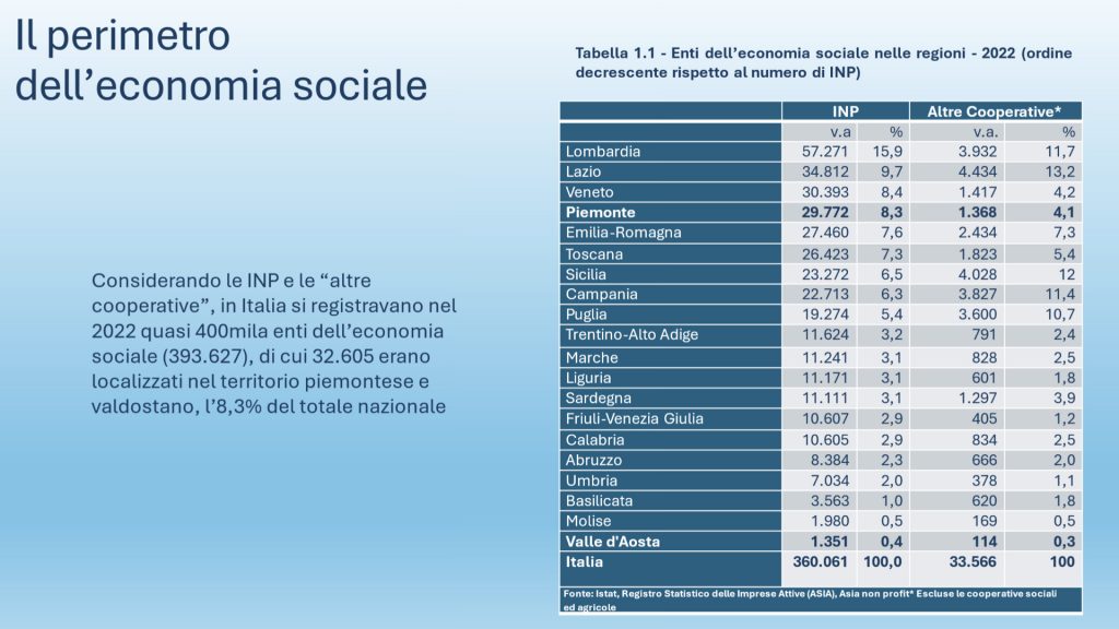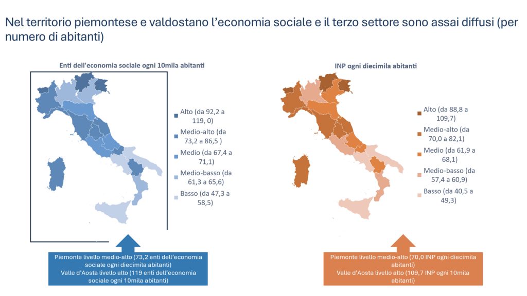 Inoltre, è da sottolineare che nel territorio piemontese e valdostano l’economia sociale e il terzo settore sono assai diffusi e sono situate, vedi figura, nel gruppo di regioni dove è più alto il numero e la densità delle organizzazioni in rapporto alla popolazione. In particolare, la Valle d’Aosta raggiunge l’indicatore massimo, 119 enti di economia sociale e 109,7 INP ogni diecimila abitanti. Il Piemonte presenta valori medio-alti: tasso pari a 73,2 enti dell’economia sociale e 70 INP ogni diecimila abitanti.