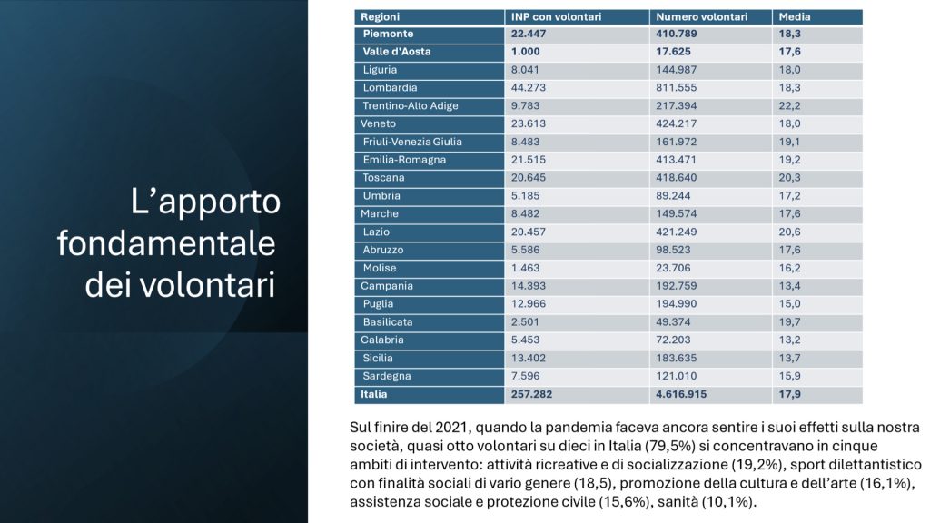 «Dal Report – conclude il presidente Luigi Bobba – emerge un forte dinamismo dei soggetti dell’economia sociale con dati in crescita delle Istituzioni non profit (INP) e degli Enti del Terzo settore nello scorso decennio, sia in Italia che in Piemonte e Valle d’Aosta. Così come notiamo il rapido popolamento del RUNTS. Bisogna, inoltre, riflettere sulle cooperative di produzione e lavoro che perdono 156 mila unità, circa un terzo, sia in Italia (-26,7%) che in Piemonte (-27,7%) e Valle d’Aosta (-10,2%). Mentre regge bene il volontariato che conta 4,6 milioni di italiani, 410mila in Piemonte e 17mila in Valle d’Aosta. Si tratta di “un capitale sociale” che deve essere riconosciuto e valorizzato sia dal punto di vista dell’impatto economico, sia per il fondamentale apporto alla coesione sociale e al sostegno dei soggetti più fragili».