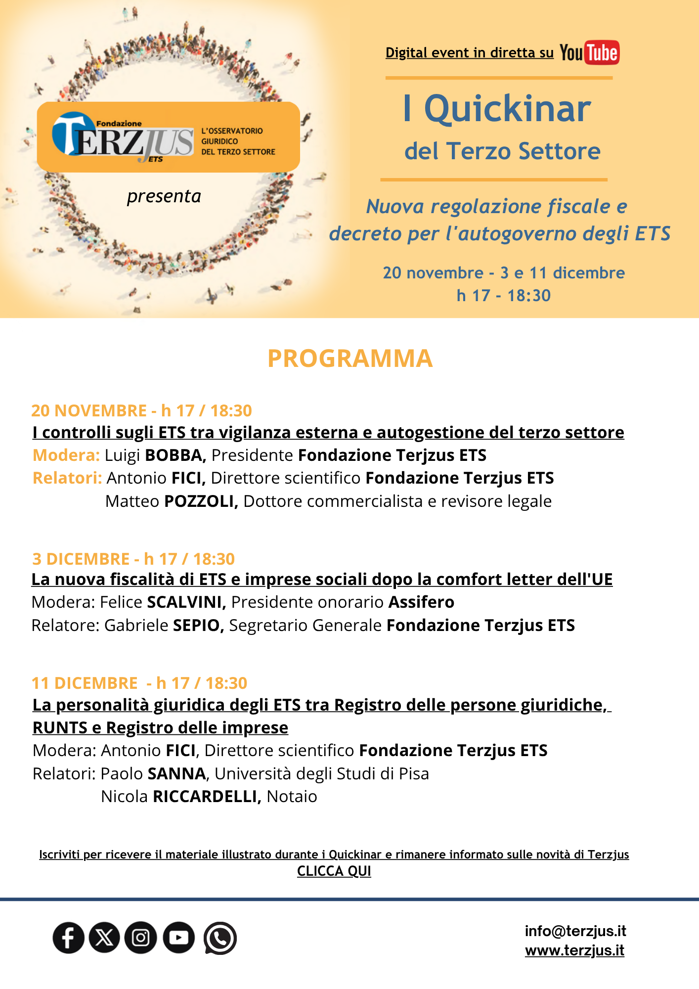 Fondazione Terzjus lancia il nuovo ciclo di Quickinar, una serie di webinar di circa un’ora dedicati alla formazione agile e smart sul Terzo Settore, che si svolgeranno in diretta streaming sul canale YouTube ufficiale di Terzjus. Dopo il successo delle edizioni precedenti, questa nuova sessione si concentrerà su temi di grande attualità come la nuova regolazione fiscale degli Enti del Terzo Settore (ETS), il decreto per l’autogoverno degli ETS e il Registro Unico Nazionale del Terzo Settore (Runts).