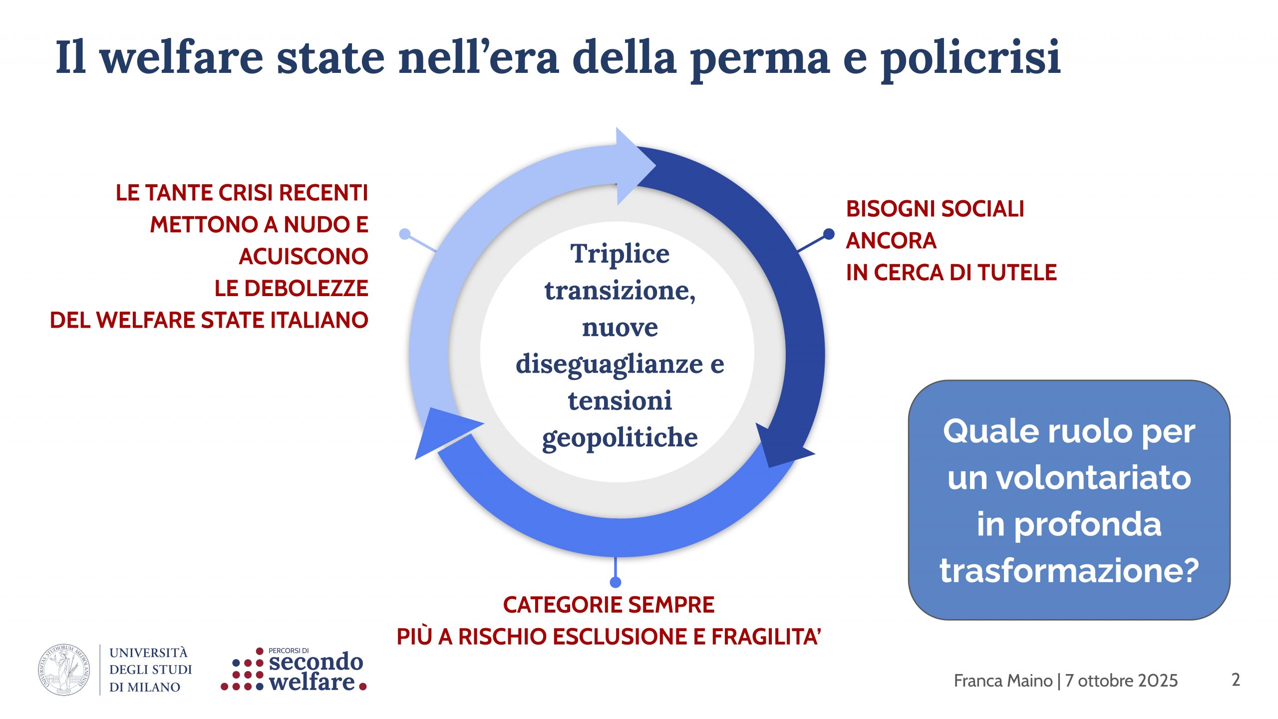 Il welfare state italiano si trova oggi a fronteggiare una triplice transizione caratterizzata da crescenti disuguaglianze sociali e tensioni geopolitiche, con una domanda sociale in aumento, soprattutto nelle categorie più vulnerabili e a rischio esclusione. In questo scenario, il ruolo del volontariato cambia: non più mero fornitore di servizi per la pubblica amministrazione, ma agente attivo di sviluppo e innovazione a favore delle comunità territoriali. La pubblica amministrazione stessa è chiamata a una piena assunzione di responsabilità, senza centralizzazione decisionale, con nuovi modelli di coprogrammazione e collaborazione.